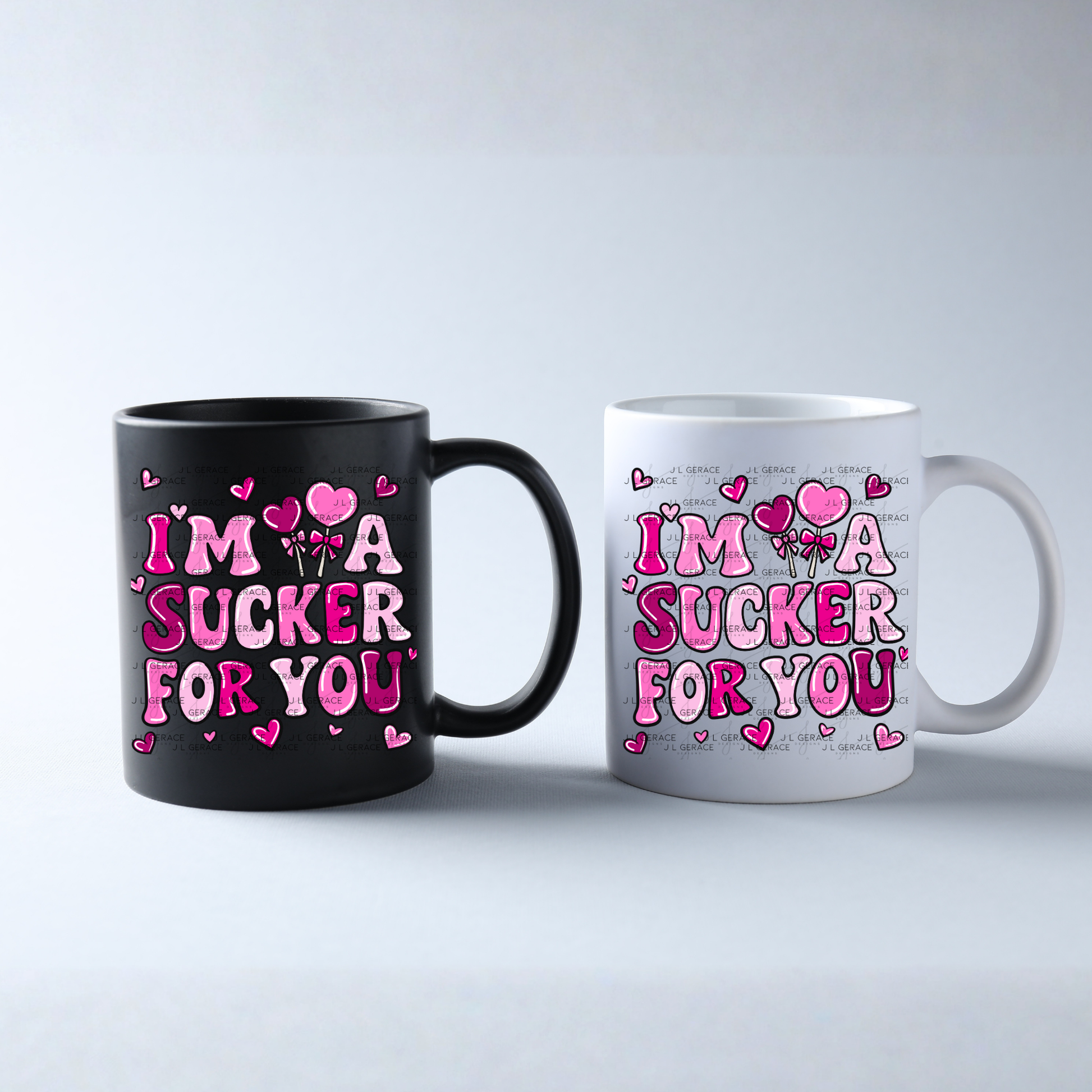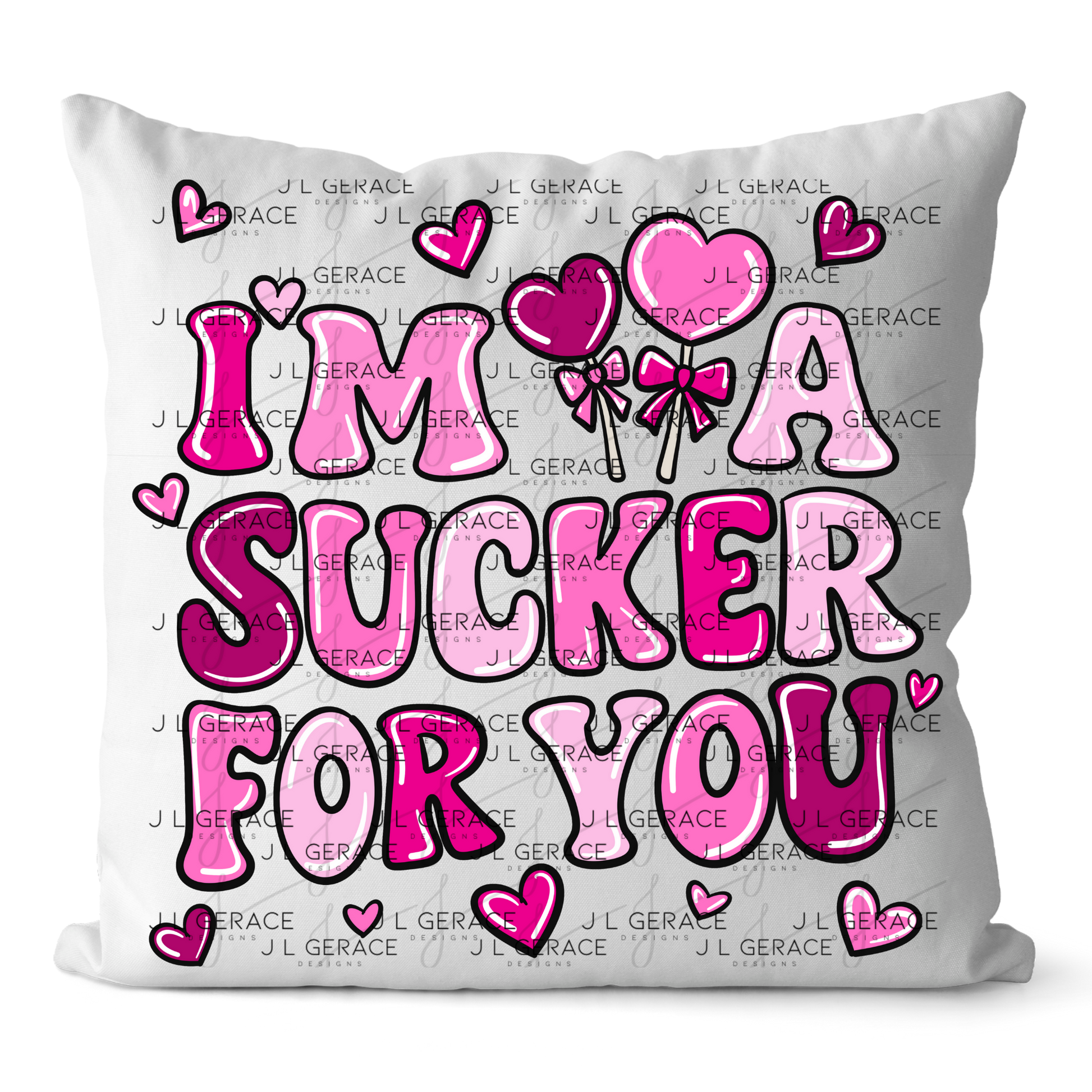 This I’m a Sucker for You PNG features bold, rounded bubble-style lettering in layered shades of pink and magenta with a smooth glossy finish. The phrase is accented with heart-shaped lollipop graphics, small floating hearts, and playful Valentine details that enhance the candy-themed design without overpowering the lettering. The strong black outline ensures excellent contrast and readability on both light and dark backgrounds.