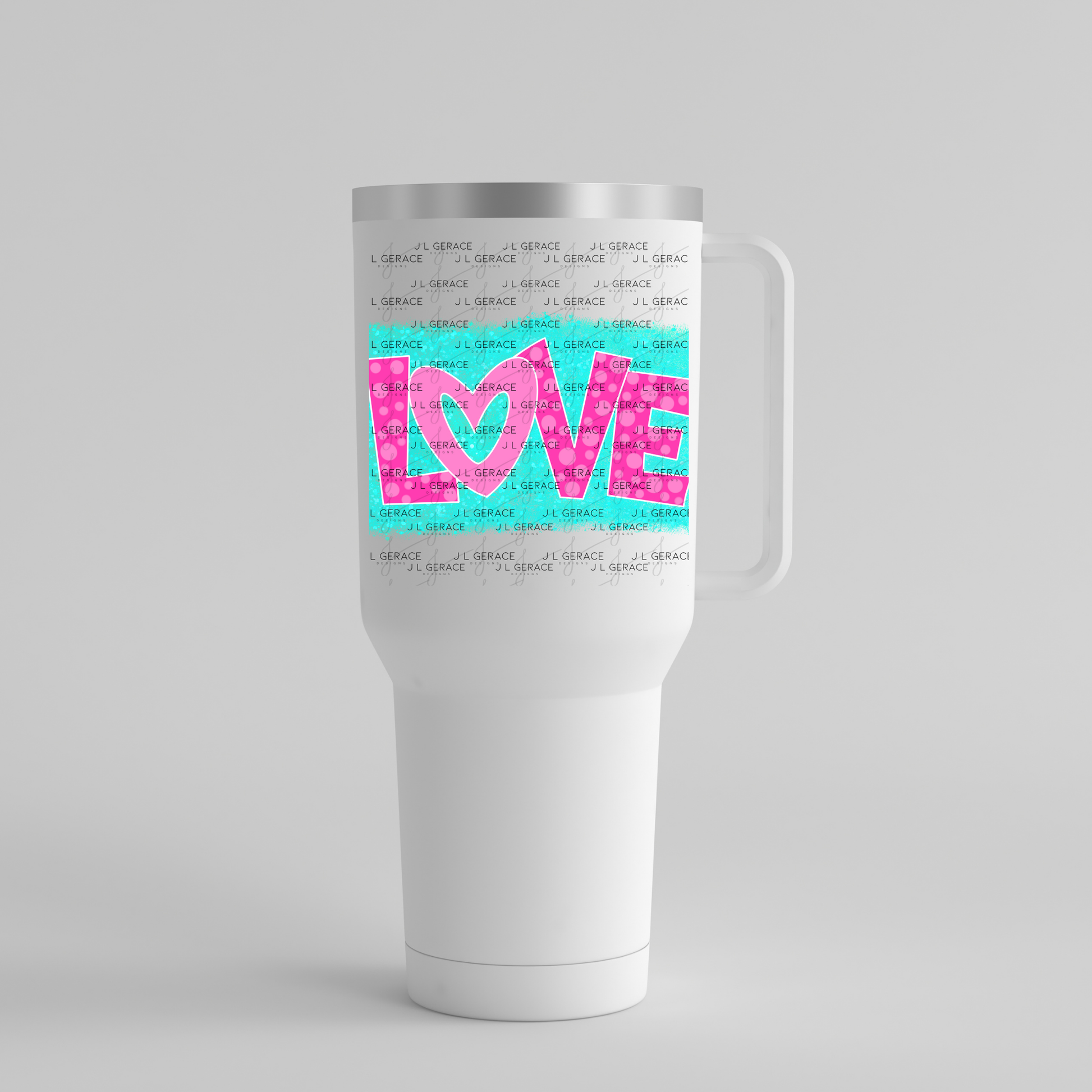 This Pink Polka Dot LOVE PNG features bold block-style lettering spelling LOVE, with playful pink polka dot-filled letters outlined in white. The O is shaped like a heart, adding a soft Valentine touch. The word sits on a teal glitter-textured brush-style background, giving the design depth and contrast while keeping the lettering clean and readable.