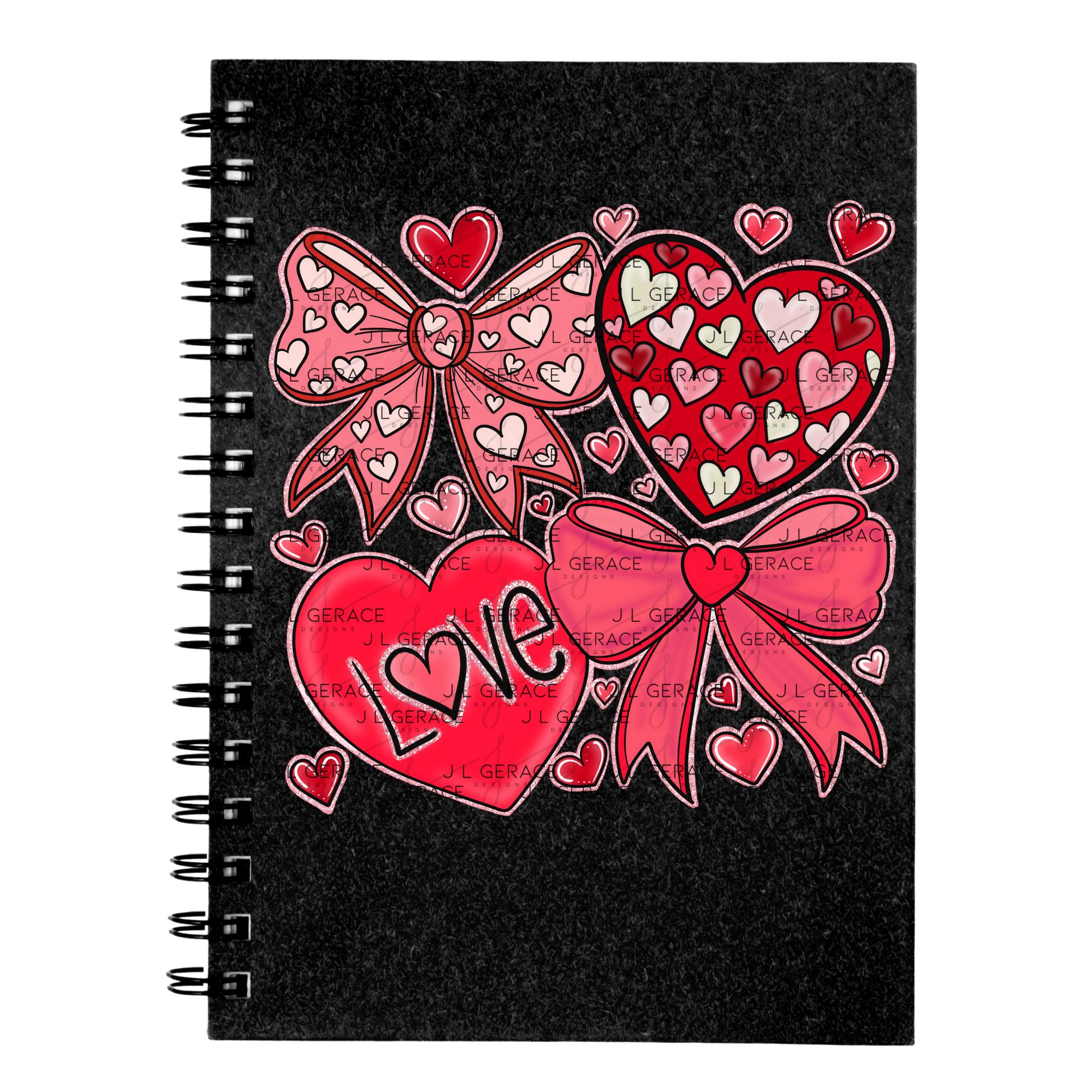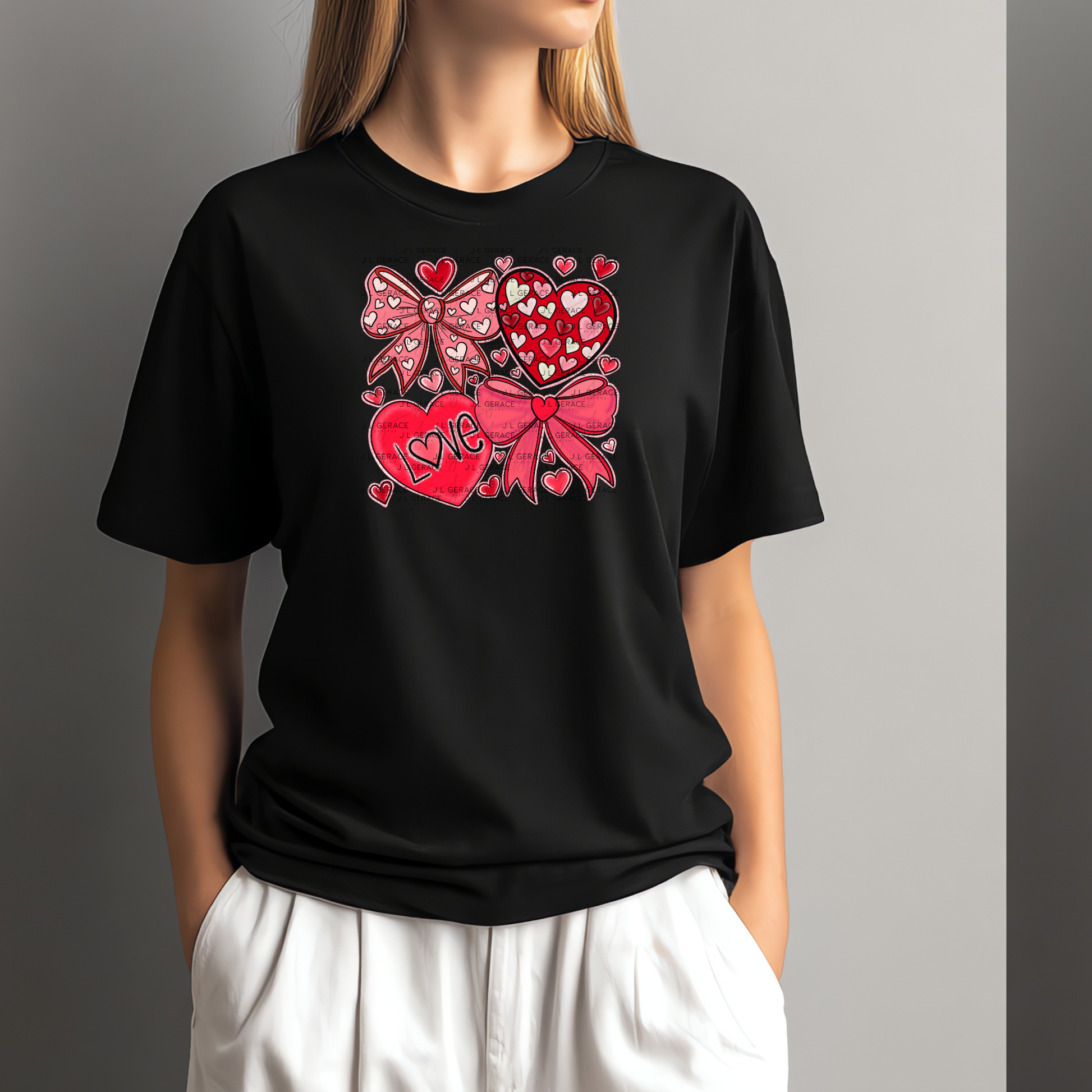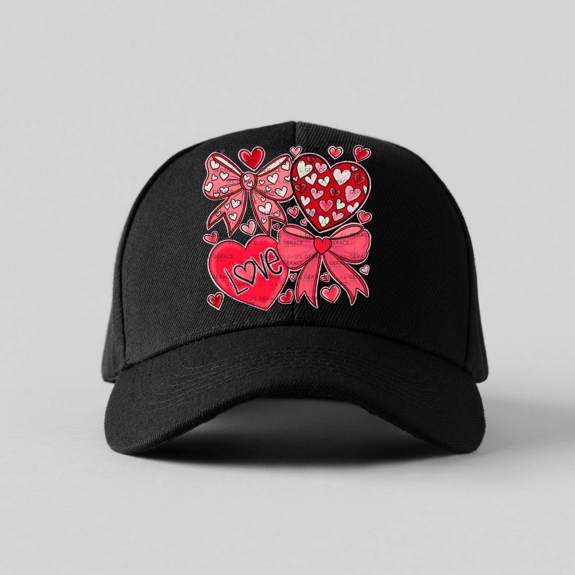 • Hearts, bows, and LOVE typography