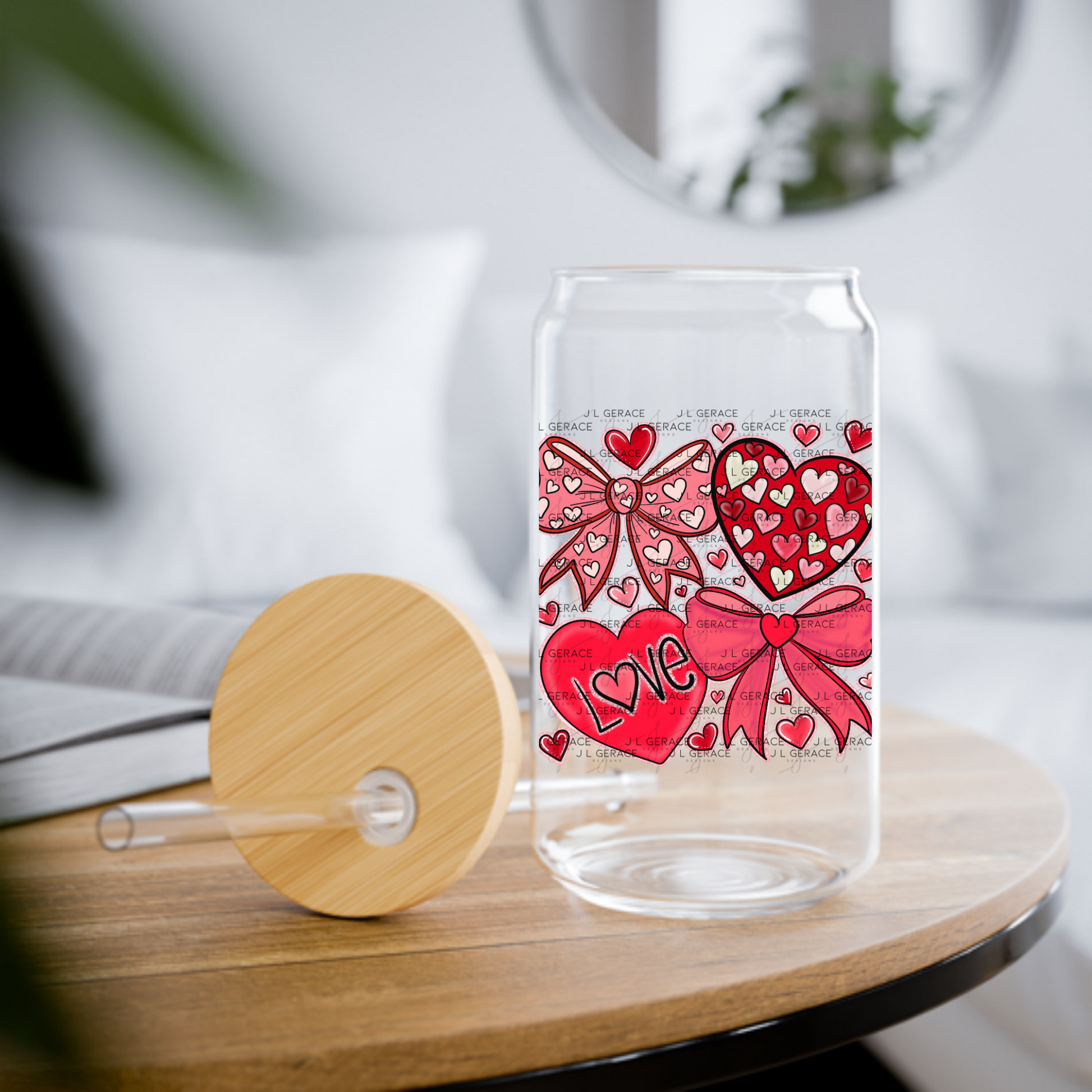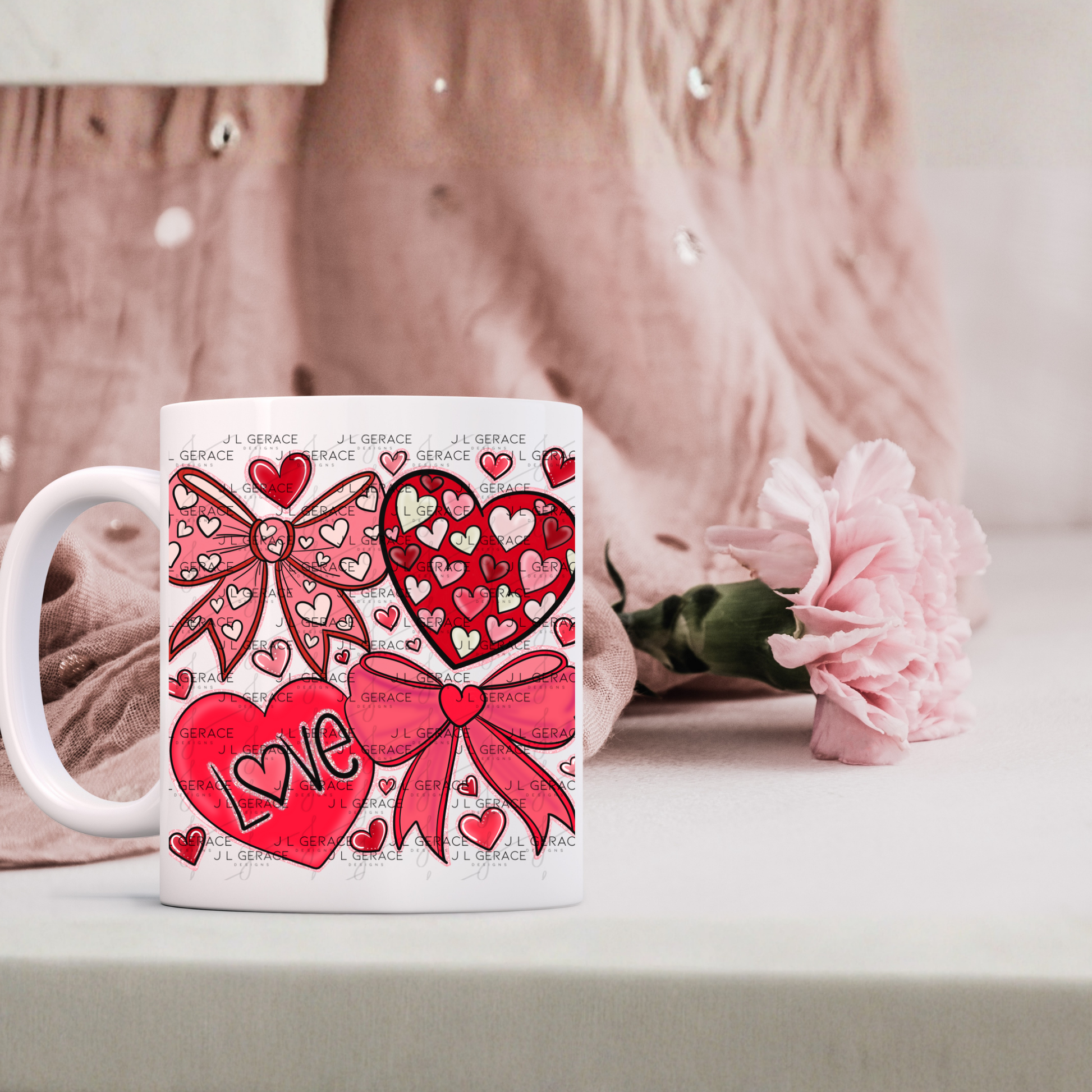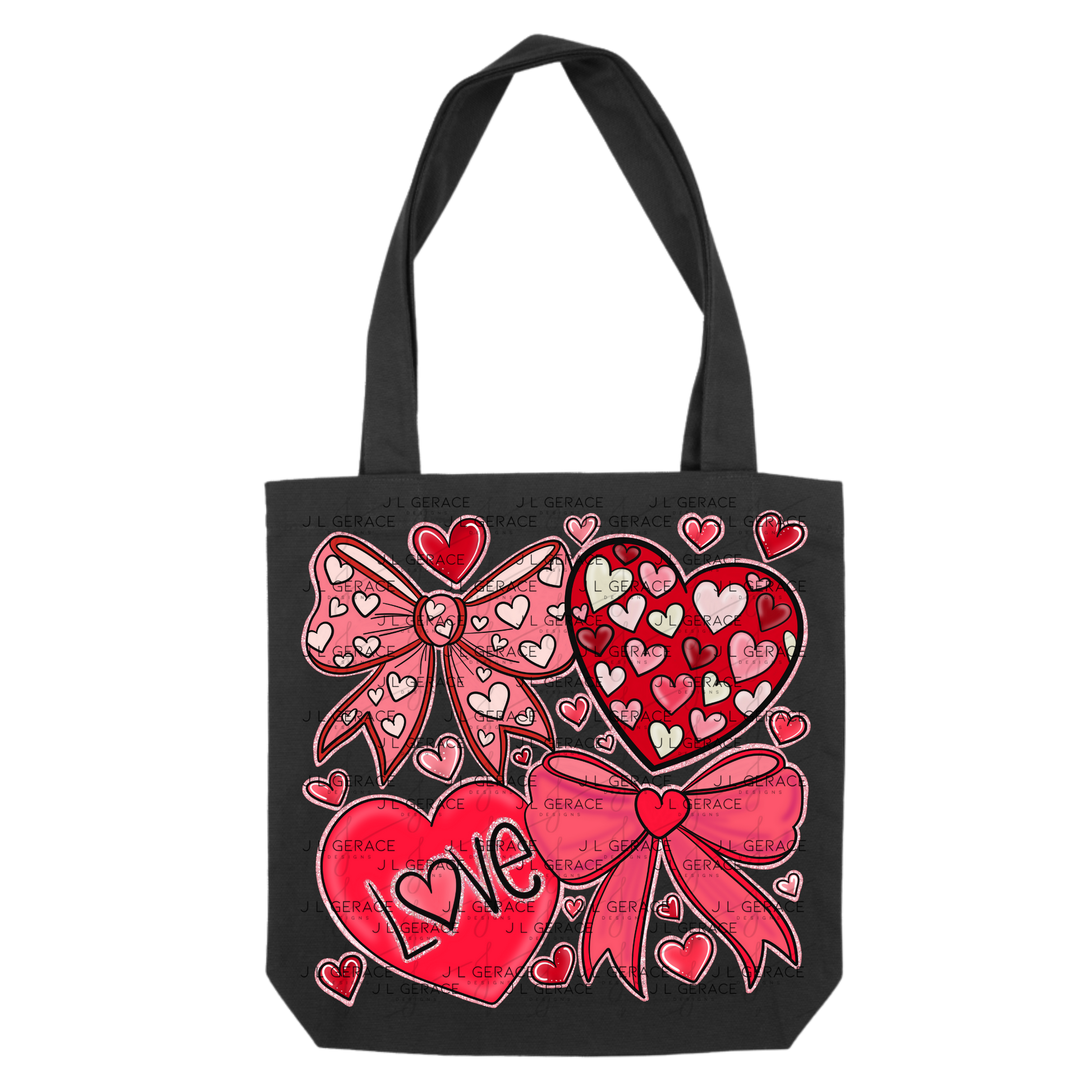 • Hearts, bows, and LOVE typography